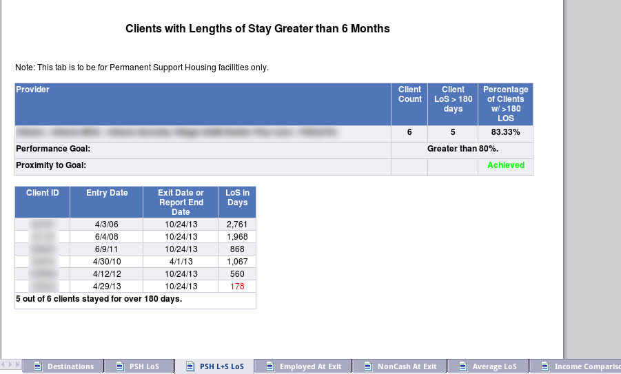 I think this design is good because you can see the goal compared to your numbers, and then you can see exactly which client is being counted that isn’t within the goal, so you can check for accuracy, or reflect on what happened with that client. It involved some pretty fun formulas that adjust based on which program type the provider you pick is. If I’d picked an Emergency Shelter and looked at this particular tab, it would have said “There is no goal for this measure.” and instead of “Achieved”, it would have said “N/A”.