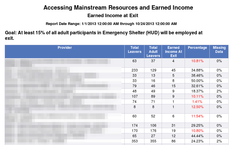 In this case, I ran the report on Emergency Shelters, so the blurred out Provider column is showing a list of Emergency Shelters, along with their specific numbers. I am using alerters to make anything under the goal be red, and anything above 2% missing data to be red as well.