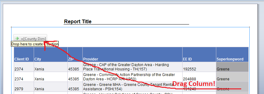 Another trick is to pull a column out into its own section. Sometimes it is helpful to break up your report into sections based on a certain data object. See Figure 8!