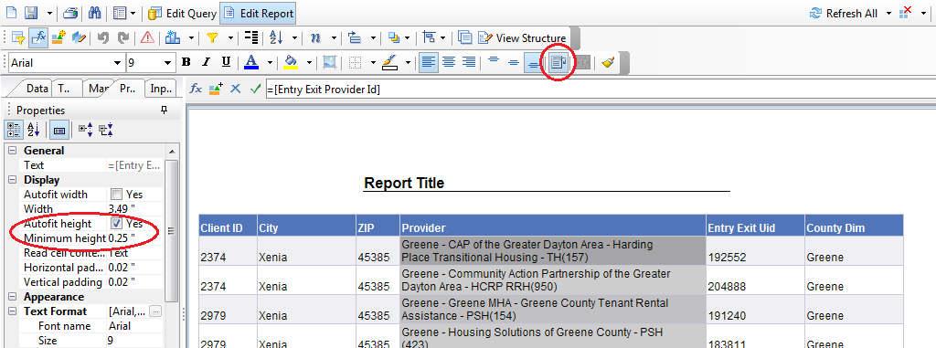 Wrap: Click the button in the top red circle to wrap the text for that column. It will still not look great because the height of the rows will need to be adjusted as well. To fix this, check the left sidebar and adjust the circled settings: check Autofit Height and then reset Minimum Height to 0.25″. Check the results in Figure 5!