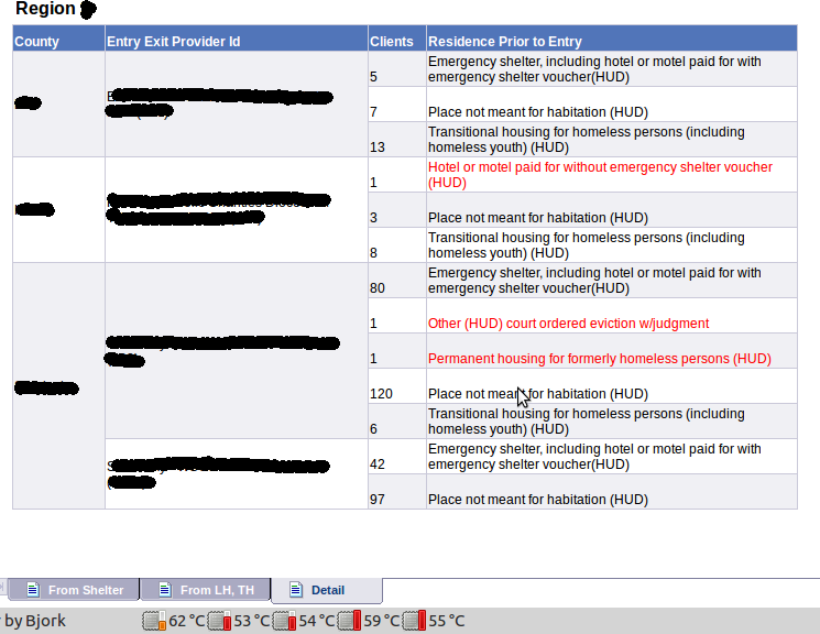 This report is used as a way of spotting problem areas in our expansive geography so that technical assistance can be focused on those providers who are either getting most of their clients from institutions, are serving ineligible clients, or are consistently answering the Residence Prior question incorrectly. You can see above on the Detail tab that a client has “Other (HUD)” and then in the comments, they wrote that they had an eviction, but that does not speak to the question of where the client slept the night before. (An eviction doesn’t automatically mean Literally Homeless…)
