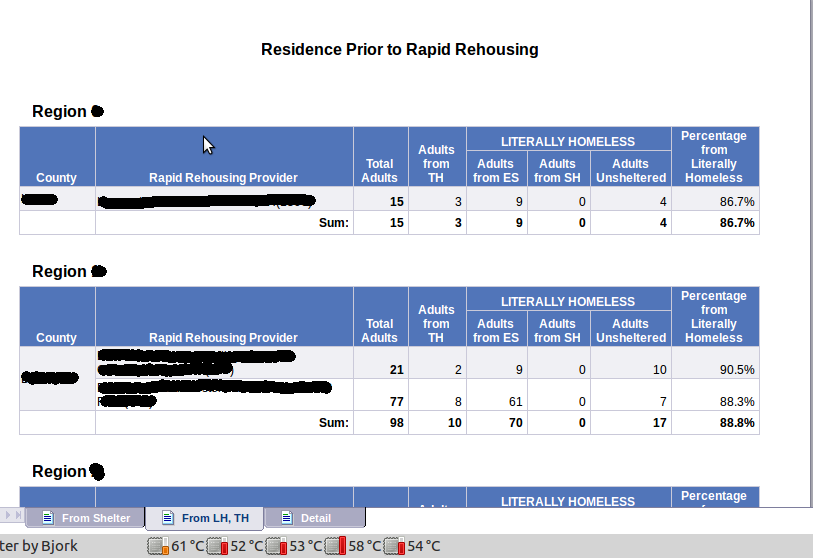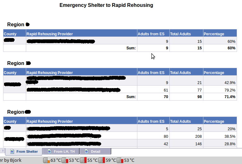 Anyway, this report is just one of many that is helping us to look at our Rapid Rehousing projects and get more traction with that money toward ending homelessness. Stay tuned for the next couple of blog posts where I will detail some of the other reports we’re using to examine our Rapid Rehousing projects.